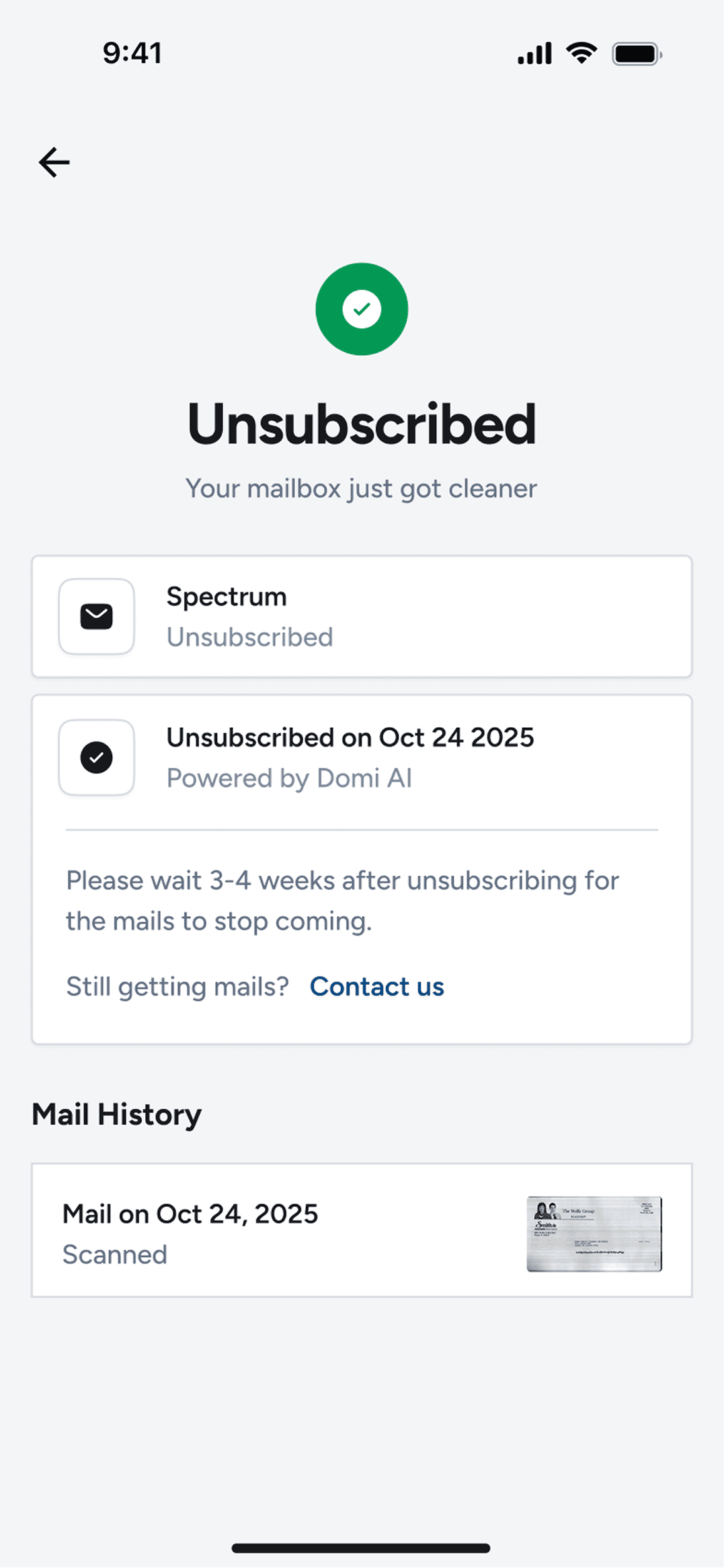 Domi Cortex helps you instantly unsubscribe from catalogs, credit offers, and spam mailers.